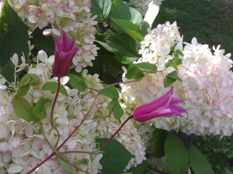Clematis Duchess of Albany Growing through a Hydrangea