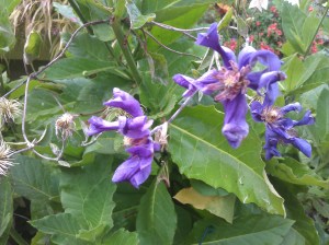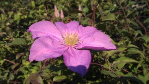 This clematis has sumptuous and velvety deep dark purple flowers with rich red overtones on opening, then ages to a lighter reddish purple. It always stops me in my tracks whenever I see it in bloom (even if I just saw it a minute ago!). This large clematis (up to 12 or 14 feet) is always recognizable to me, even from a distance, for its size, its lush purple color, and the spacy-ness of its flowers. Its tepals spread out gracefully, leaving space between them, especially at the base, where the tepals narrow near the center of the flower like the base of a spoon, adding a special charm. C. ‘Gipsy Queen’, a sun lover, is easy to grow and comes on strong (at least for me) in late July and August when so many of my other clematis are beginning to wind down.