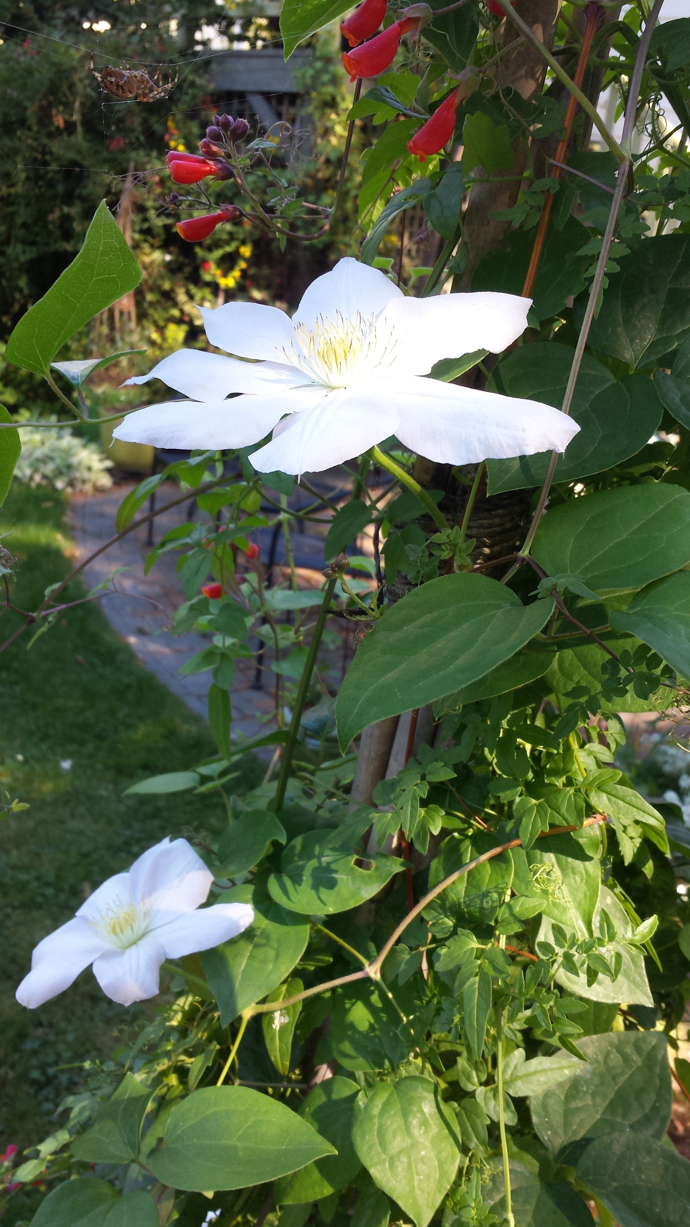 I was loosing my patience with C. Duchess of Edinburgh, too.  This clematis had one woody stem with no flowers and scorched ugly leaves.  Yuch!  I couldn’t take it.  Even though I might seriously set it back, I chopped it to about six inches.  It’s in a pot with a great-looking, heat-loving Chilean Glory Vine (probably a little crowded in there), so I didn’t miss the clematis much.  Well, to my surprise, C. Duchess of Edinburgh came back FAST with big fresh new leaves — and a bit later with several big fat buds!  The blooms were not double as they are in the spring, but they were lovely large pristine white blooms that looked great with all the greenery.  I wonder if clematis leaves grown in the cool moist spring and early summer in Seattle just aren’t programed to take our hot dry summers.  In my experience (especially this summer)  leaves that come into being in the heat of summer handle hot and dry just fine.