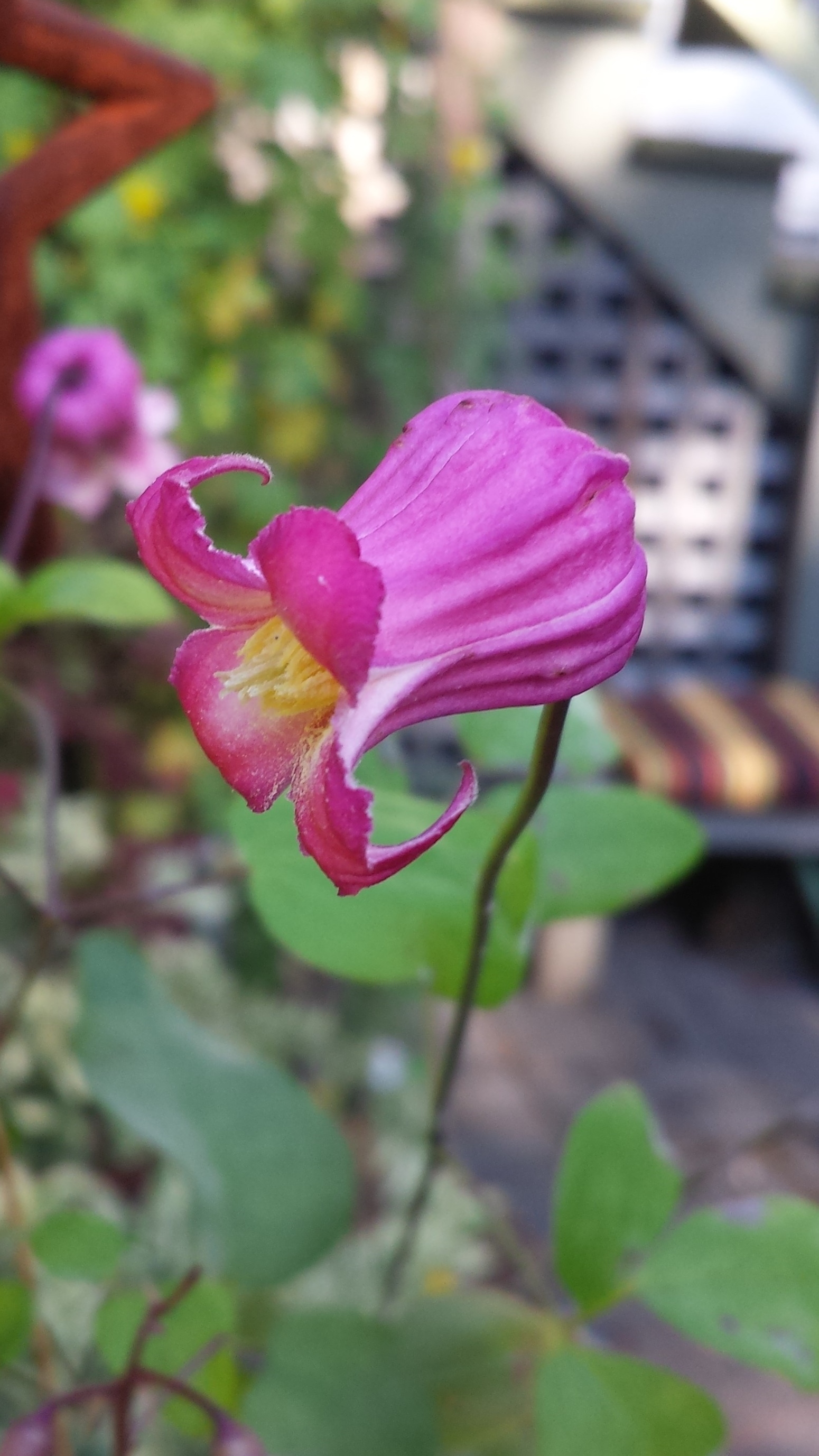 A slightly tattered Clematis Omoshiro (oh, those pesky slugs!).